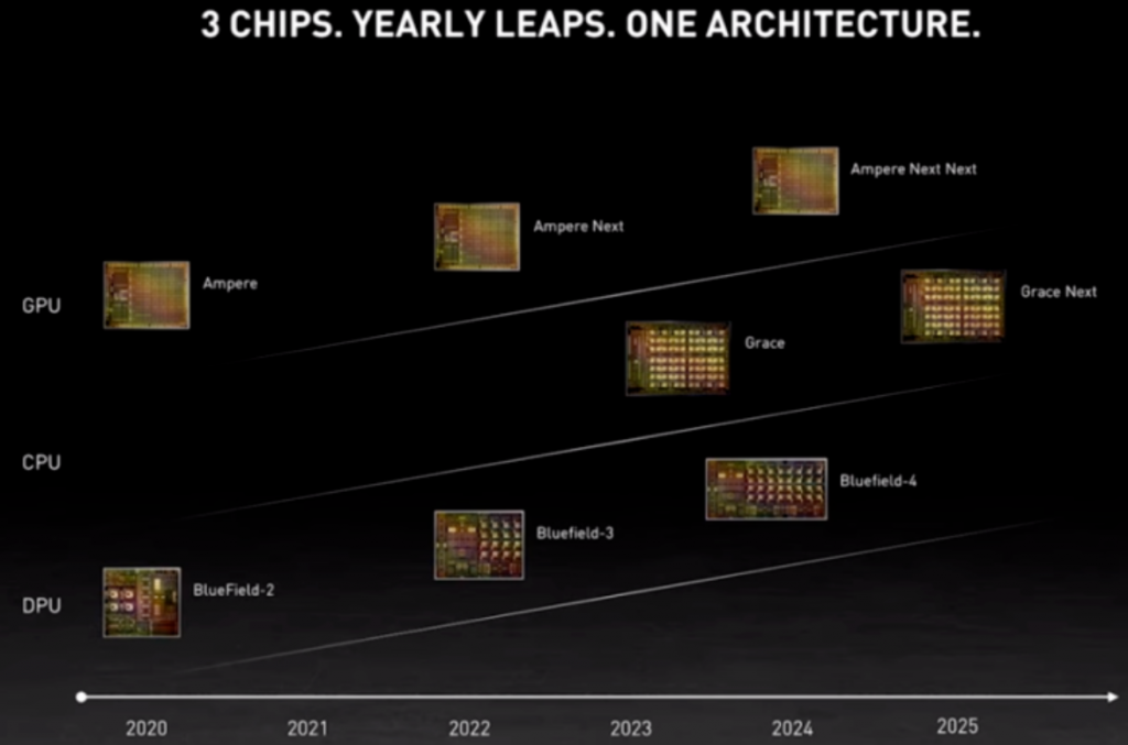 英偉達在四月中旬的GTC 21上,CEO黃仁勛不僅發布了基于ARM的專用CPU GRACE,還更新了英偉達最新的數據中心芯片路線圖,GPU、CPU和DPU三類芯片逐年更新。