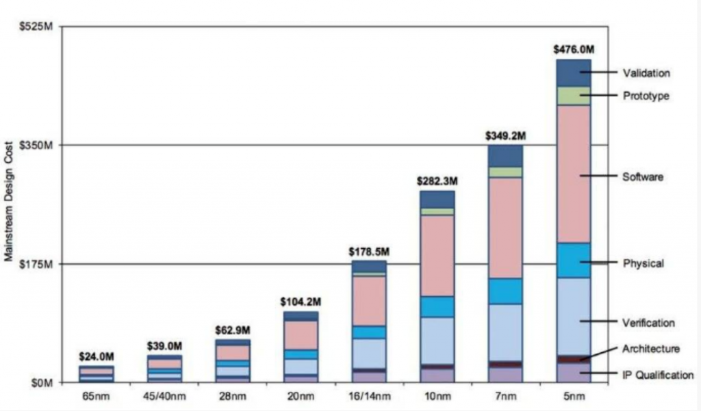 原因除了7nm的技術難度更大,也和成本密切相關。市場研究機構International Business Strategies (IBS)給出的數據顯示,28nm之后芯片的成本迅速上升。28nm工藝的成本為0.629億美元,到了7nm和5nm,芯片的成本迅速暴增,5nm將增至4.76億美元。三星稱其3nm GAA 的成本可能會超過5億美元。