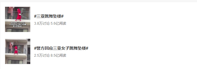 警方通報細節進一步推高輿情熱度。原視頻被轉發至微博后,@海南警方在兩小時后就做出回應,證實該女子是在陽臺外跳舞時墜樓,并指出“房間內還留有一封遺書”。觀察發現,此次輿情事件的原話題#三亞跳舞墜樓#的閱讀量為5.2億,而#警方回應三亞女子跳舞墜樓#的閱讀量則超過了8.1億。這說明這則簡短的通報中披露的更多細節,再次引起了網民的好奇心。