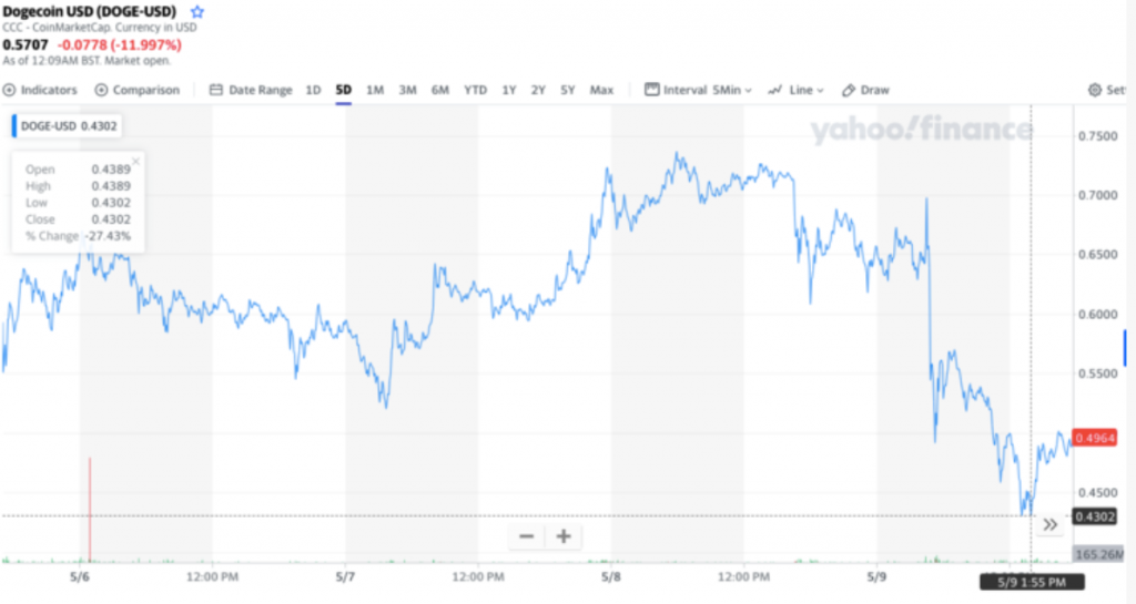 按照CoinMarketCap的監測數據,狗狗幣最低點降到了0.4302美元,較過去24小時內最高點0.7242美元,跌去了近41%。