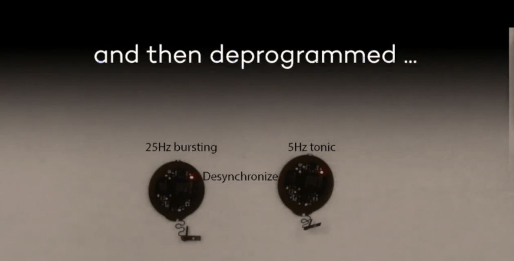 具體的實驗表明,當兩只小鼠在封閉環(huán)境中彼此靠近時,研究人員可以無線同步,激活大腦區(qū)域中與高級執(zhí)行功能相關(guān)的一組神經(jīng)元,使得小鼠交流的頻率和持續(xù)時間增加;而這對小鼠的互動則可通過去同步化刺激迅速減少。