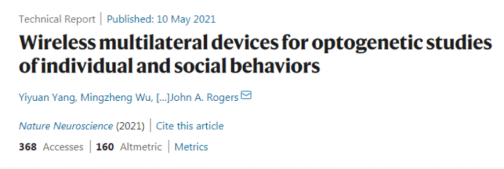 2021 年 5 月 10 日,相關(guān)論文發(fā)表于 Nature 子刊 Nature Neuroscience(《自然-神經(jīng)科學》),題為 Wireless multilateral devices for optogenetic studies of individual and social behaviors(用于個人和社會行為的光遺傳學研究無線多邊裝置)。