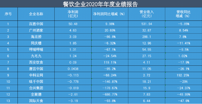 截至5月21日,國內(nèi)餐飲上市企業(yè)2020年年報發(fā)布已基本結(jié)束。過去一年,突發(fā)的新冠肺炎疫情讓餐飲業(yè)經(jīng)歷了“至暗時刻”,新京報記者梳理13家上市餐飲企業(yè)年報發(fā)現(xiàn),2020年有5家餐企業(yè)績虧損,7家餐飲企業(yè)營收、凈利潤同比雙下滑。