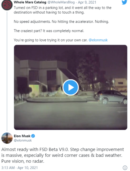 今年4月,馬斯克發文表示,特斯拉全自動駕駛(FSD)Beta v9.0版已準備就緒,即將陸續向用戶推送。特斯拉原來準備在4月發布FSD Beta 8.3,更新被擱置以后,特斯拉準備直接發布自動化駕駛程度更高的FSD Beta 9.0版本。