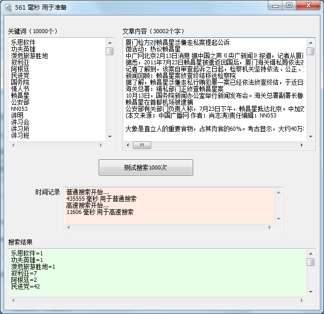 在新版本中,我們完全拋棄了舊算法,另辟蹊徑,重起爐灶,反復試驗摸索,花了幾周時間,最終優化結果可達: 在3萬字的文章中查找1萬個關鍵詞的出現次數僅需11.6毫秒,速度整整提升了40倍。