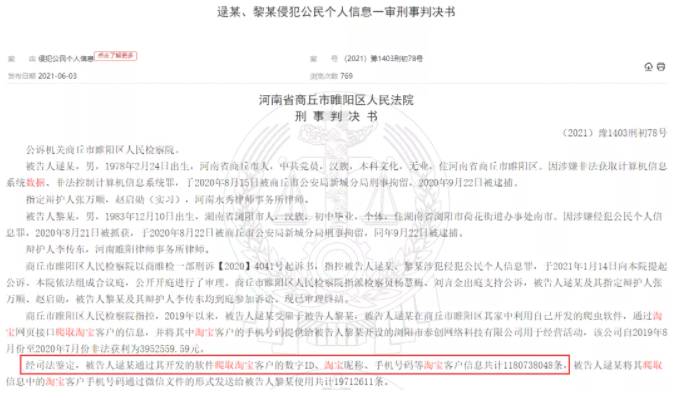 近日,商丘市睢陽區人民法院在裁判文書網,公開了一份刑事判決書,顯示一名住在河南商丘市的本科畢業的大學生逯某自2019年11月起,對淘寶實施了長達八個月的數據爬取并盜走大量用戶數據。在阿里巴巴注意到這一問題前,已經有超過11億8千多萬條用戶信息泄露。