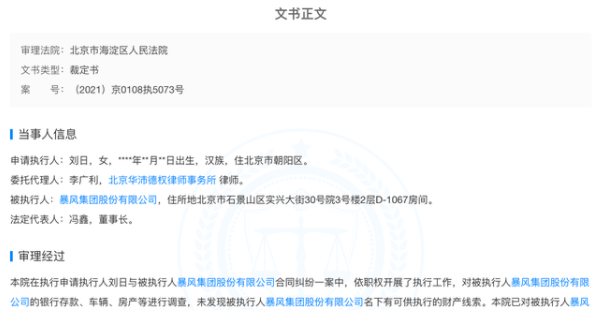 樂思網絡輿情監測發現,暴風集團A股謝幕8個多月后,已無財產可供執行。7月6日,記者注意到,裁判文書網新增一份《劉日等合同執行裁定書》,申請執行人劉某,被執行人為暴風集團股份有限公司。案號(2021)京0108執5073號,審理法院為北京市海淀區人民法院。