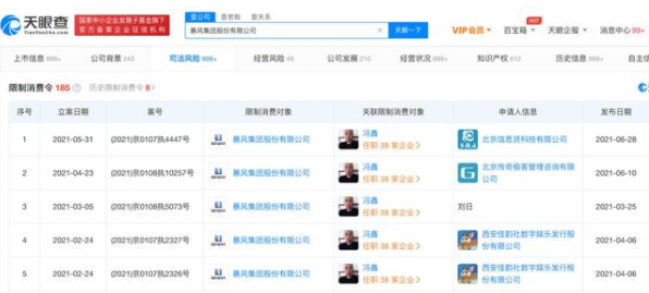 據天眼查數據顯示,目前暴風集團共有185條限制消費令,涉及的法律訴訟高達1376起。