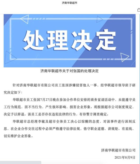 樂思網(wǎng)絡(luò)輿情發(fā)現(xiàn),8月9日下午,對(duì)于“阿里女員工被侵害”中的涉事員工,濟(jì)南華聯(lián)超市發(fā)布了處理決定。
