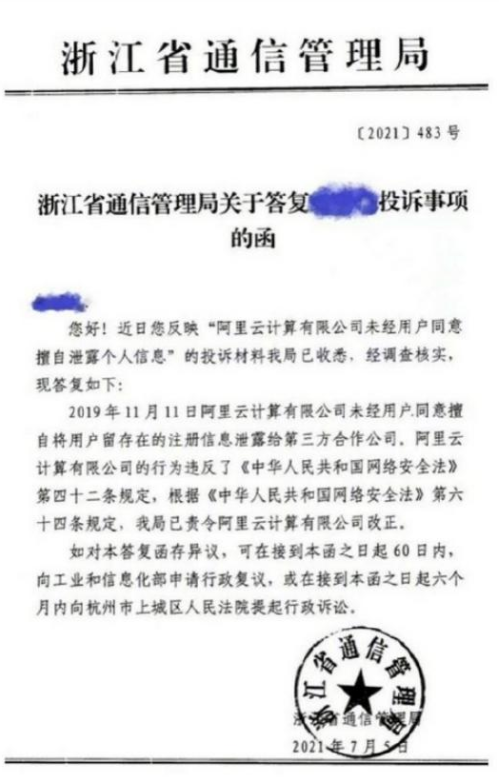 樂思網絡輿情發現,網絡流傳一份浙江省通信管理局 7 月 5 日對投訴人的答復函,核實稱此前阿里云計算有限公司未經用戶同意擅自將用戶留存在的注冊信息泄露給第三方合作公司。