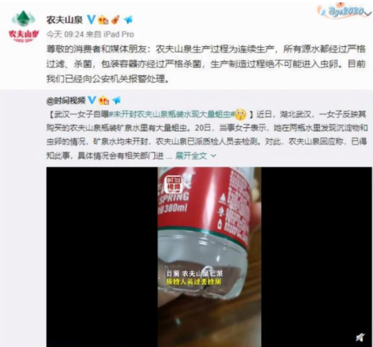 10月21日,@農夫山泉 回應:農夫山泉生產過程為連續(xù)生產,所有源水都經過嚴格過濾、殺菌,包裝容器亦經過嚴格殺菌,生產制造過程絕不可能進入蟲卵。目前已經向公安機關報警處理。