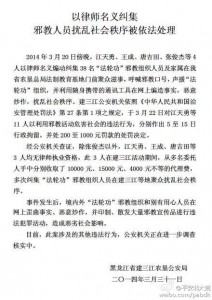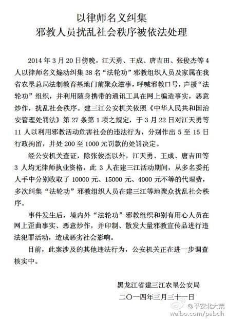 2014年3月20日傍晚,江天勇、王成、唐吉田、張俊杰等4人以律師名義煽動糾集38名“法輪功”邪教組織人員及家屬在我省農墾總局法制教育基地門前聚眾滋事,呼喊邪教口號,聲援“法輪功”組織,并利用隨身攜帶的通訊工具在網上編造事實,惡意炒作,擾亂社會秩序。建三江公安機關依照《中華人民共和國治安管理處罰法》第27條第1項之規定,于3月22日對江天勇等11人以利用邪教活動危害社會的違法行為,分別作出5至15日行政拘留,并處200至1000元罰款的處罰決定。