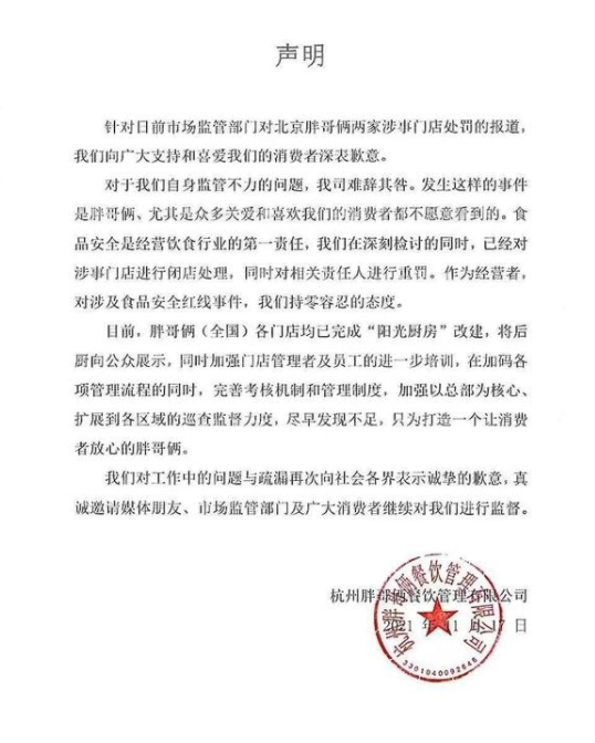 對此,胖哥倆發布聲明稱,“目前,胖哥倆(全國)各門店均已完成‘陽光廚房’改建,將后廚向公眾展示,同時加強門店管理者及員工的進一步培訓。”