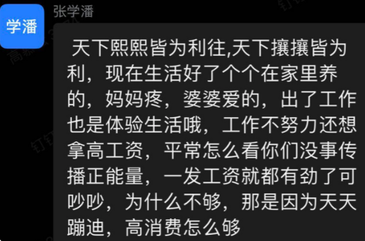 據發帖員工稱,這次員工的抱怨引發公司內部大戰,有疑似茶顏悅色高層稱:“為什么不夠,那是因為天天蹦迪,高消費怎么夠……德不配位,必有災殃,你有多大本事拿多少錢”。