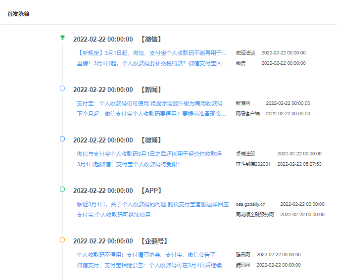 近三天,根據(jù)樂(lè)思輿情監(jiān)測(cè)系統(tǒng)顯示關(guān)鍵詞“支付寶+個(gè)人收款碼”獲取到5808篇信息,主要分布在微信公眾號(hào)、新浪微博、騰訊網(wǎng)、網(wǎng)易、搜狐。