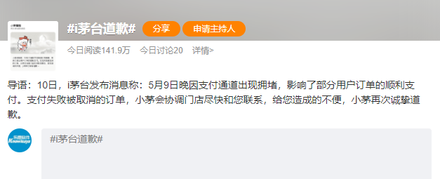 10日,i茅臺App向昨日未能成功支付訂單的消費者致歉,并稱,“因支付通道出現擁堵,支付失敗被取消的訂單,小茅會協調門店盡快和您聯系”。#i茅臺回應申購成功無法付款# #i茅臺道歉# #i茅臺中簽有多難#相關話題登上話題榜單,其中,#i茅臺道歉#話題引發較多圍觀,截至目前有6640.1?萬人次閱讀,1634人次討論。