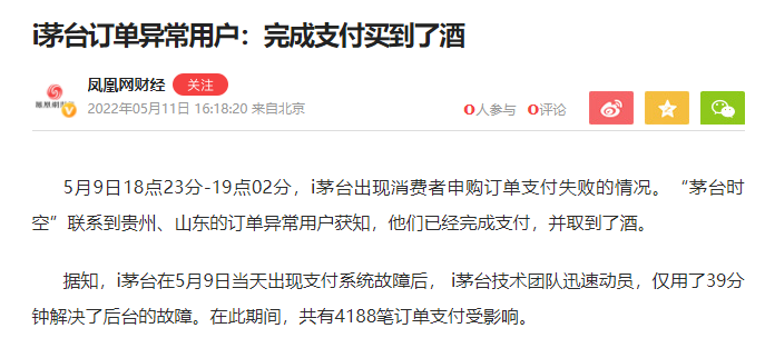 5月9日晚,多名用戶稱收到i茅臺APP發來的茅臺酒申購成功短信后,在線上支付時始終顯示網絡異常,無法付款,期間與客服多次聯系失敗。消費者反饋因線上支付時間僅有30分鐘,支付超時就只能取消訂單。
