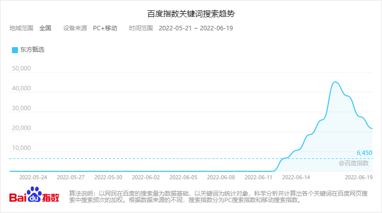 根據樂思輿情監測發現,近日關鍵詞“東方甄選”頻繁出現在網絡視野,而百度搜索指數更是在12日前后開始出現飛躍式攀升。在正面輿情不斷涌現的情況下,近日直播間出現的“壞品”輿情也開始出現在網絡視野。