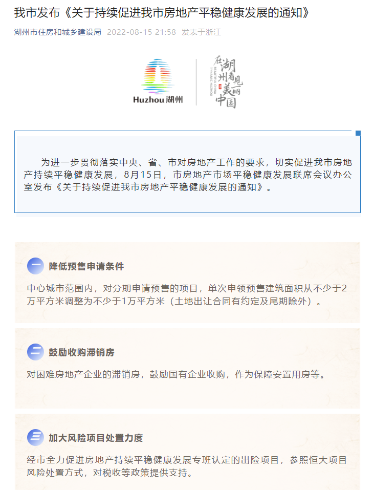 浙江省湖州市住房和城鄉建設局官方微信號15日發布《關于持續促進我市房地產平穩健康發展的通知》提到,對困難房地產企業的滯銷房,鼓勵國有企業收購,作為保障安置用房等。