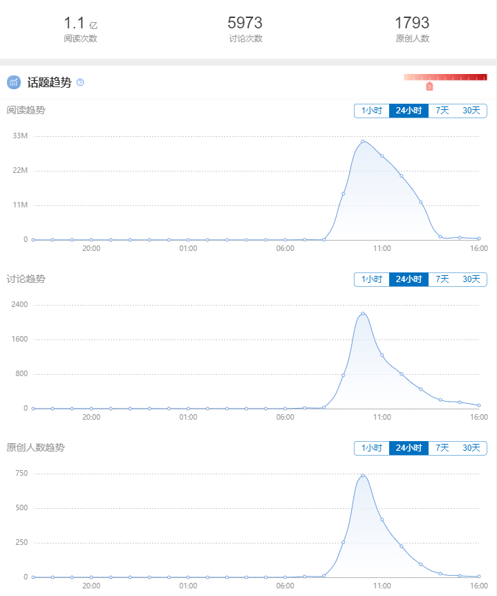 從這一熱度趨勢時間分析來看,11點前后午間休息前夕是網絡沖浪的高峰期;而從熱度持續時間來看,僅持續4個小時左右,引發一波即興熱潮,隨即褪去。