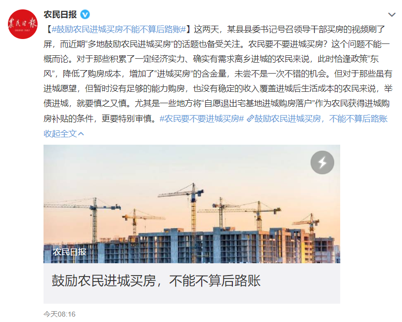 18日,針對鼓勵農民進城購房措施,農民日報發布信息表示“鼓勵農民進城買房,不能不算后路賬”,話題#農民日報評多地鼓勵農民進城買房#登上熱搜,截至目前引發1.1億次閱讀。