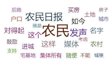 農民、農民日報、媒體、隨便等詞值得關注。其中涉及信息包括“為農民發聲,如今這樣的媒體不多了”、“反正戶口不要隨便遷,農村的土地是集體所有!”