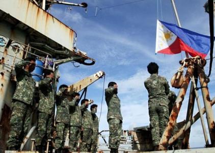 2014年3月29日,菲律賓派漁船向坐沉中國(guó)南沙仁愛礁登陸艦上駐防人員送去補(bǔ)給。同時(shí),有媒體也隨船登上坐沉戰(zhàn)艦進(jìn)行了拍攝,包括艦上駐防人員的臥室、廚房、會(huì)議室、等內(nèi)艙照。圖為菲律賓駐艦軍人升菲律賓國(guó)旗。