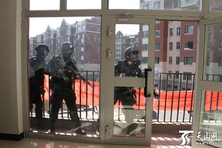 “不要過(guò)來(lái),都走遠(yuǎn)點(diǎn),不然我要砍了……”一名蒙面的男子,手持一把斧子,挾持著一名女社區(qū)工作人員,從大門口拖了出來(lái),被聞?dòng)嵹s來(lái)的特警迅速包圍。這是4月2日新疆烏魯木齊市公安局特警八支隊(duì)在烏市西山片區(qū)管委會(huì)西源社區(qū)進(jìn)行的防暴應(yīng)急處突實(shí)戰(zhàn)演練中的一幕。圖為特警從四面包抄“歹徒”。