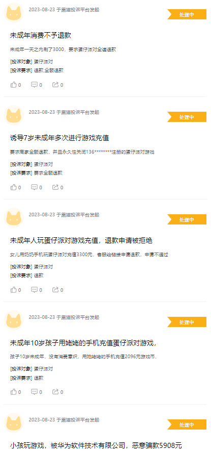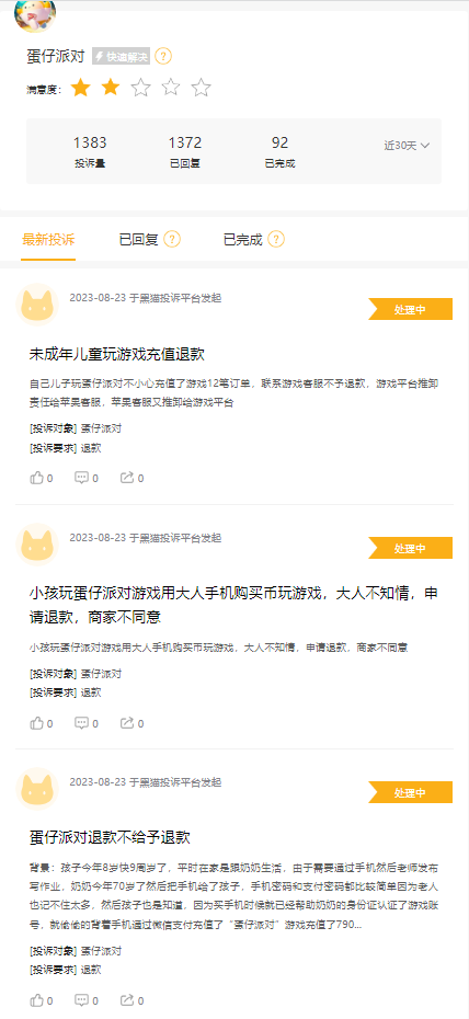 通過對平臺投訴信息來看,投訴內容主要是退款相關,但都為處理中。