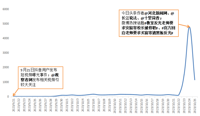 微博熱搜仍然是信息擴散傳播的重要方式,10月24日,兩條微博熱搜登上榜單持續4.5小時(微博后臺數據),截至目前,#教室反光老師要求安窗簾校長被停職#一話題,引發2.1億閱讀量,5127討論量,17.9萬互動量,2228原創量。其中@揚子晚報 發布的信息熱度最高。