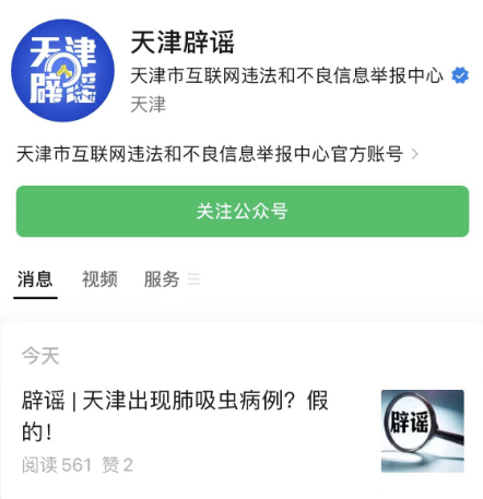 接舉報,網上正在傳播“天津出現一種新型傳染病–肺吸蟲病,已導致數百人感染,其中10多例死亡”“天津市已發現了500多例肺吸蟲病例,其中有10多例死亡”“一天確診5000人”等相關信息,引發部分市民恐慌。經核實,以上內容為虛假信息。今年以來,天津市專業部門未接到肺吸蟲病例報告。