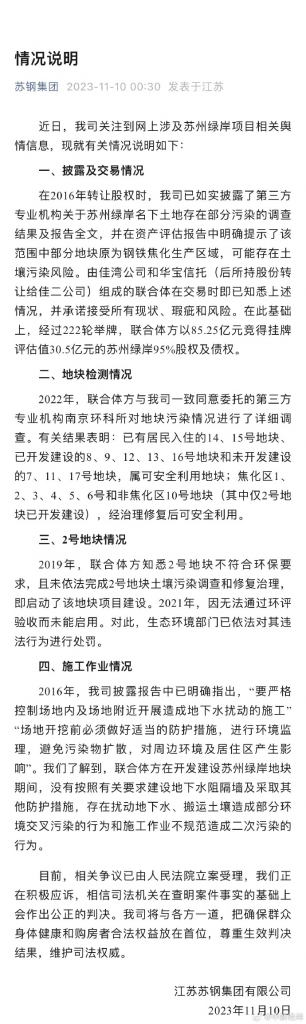 蘇鋼有問題。陸家嘴問題更大。后者是明知不可為而為之。蘇鋼把情況可是說清楚的。陸家嘴也都是知道的。說好的土地治理呢。說好的地下水防護呢。就他動工的二號地。 21年還被處罰過。他會不知道地有問題。我信他和der。房子賣的不好而已。要賣的好。他會做“正義使者”?更何況。后面還有個外資施壓
