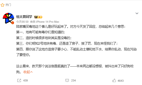 看了看蘇鋼的回應,就是:我告訴你這里有毒地塊,但是沒告訴你有這么多,然后還讓你簽了個知情協議。222輪舉牌,大家都來買毒地塊,不知道蘇鋼到底隱瞞多少東西。