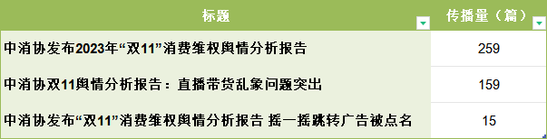 根據樂思輿情檢測系統發現,2023年11月22日,中國消費者協會發布“2023年“雙11”消費維權輿情分析報告”。