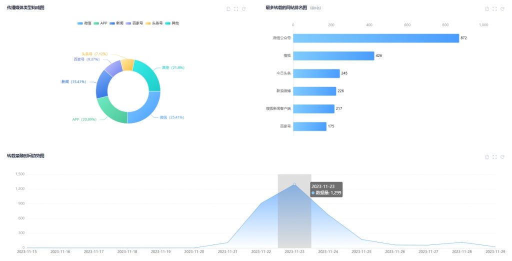 根據樂思軟件監測發現,截至目前相關輿情信息共有3427條,其中11月23日到達傳播高峰期,該日約有1299條。