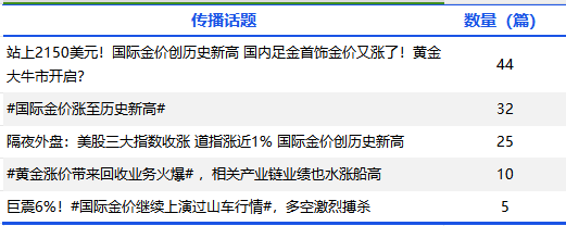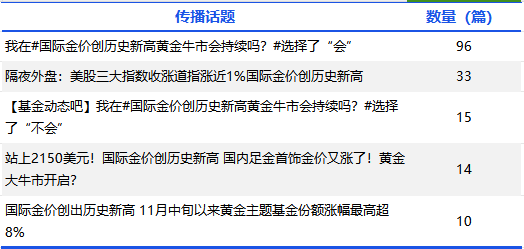 12月2日前后,@黃金熱點 發(fā)文表示“爆了!金價即將創(chuàng)歷史新高!”開始出現(xiàn)國際金價創(chuàng)歷史新高傳播小高峰,該日有183篇相關信息,隨后開始下降;