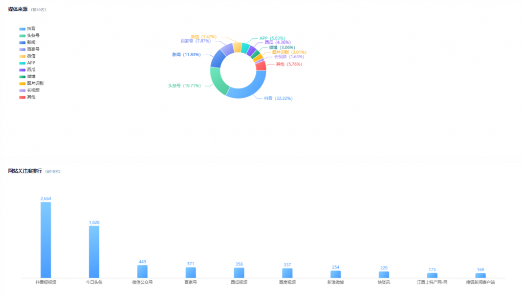 “抖音”數(shù)據(jù)量最大,高達(dá)2653篇占比32.32%;其次是“頭條號(hào)”,數(shù)據(jù)量為1618篇占比19.71%;其他媒體類型情況: “新聞”數(shù)據(jù)量971篇占比11.83%;“百家號(hào)”數(shù)據(jù)量646篇占比7.87%;“微信”數(shù)據(jù)量445篇占比5.42%