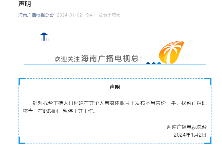 海南廣播電視總臺(tái):主持人肖程皓發(fā)布不當(dāng)言論,暫停止其工作——8家媒體報(bào)道