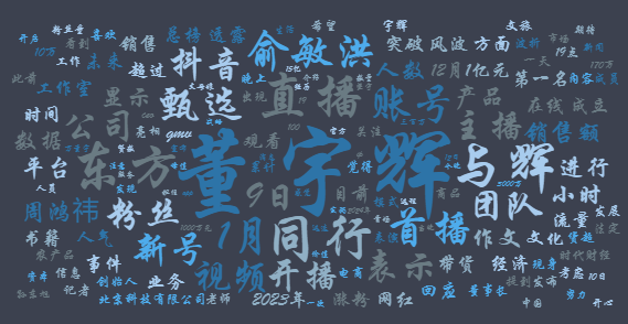 傳播熱詞以“董宇輝”為核心,涉及東方甄選、與輝同行、俞敏洪、粉絲增長等明顯高頻提及熱詞