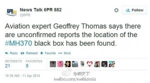 澳大利亞珀斯當地電臺“6PR”稱,航空專家托馬斯稱,有未經證實的報道稱MH370的黑匣子位置已經確定。