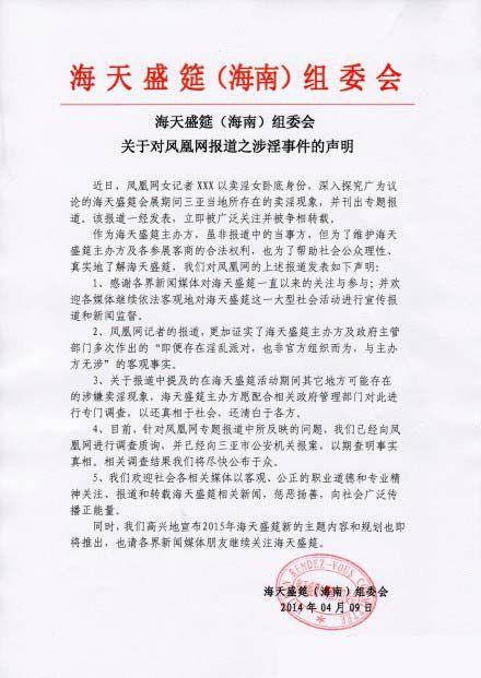 近日,某網女記者臥底海天盛筵,并曝出會展期間三亞當地所存在的賣淫現象,引起廣泛關注。昨日,海天盛筵主辦方發聲明稱,已經向該媒體進行調查質詢,并向三亞市公安機關報案,相關調查結果將盡快公諸于眾。