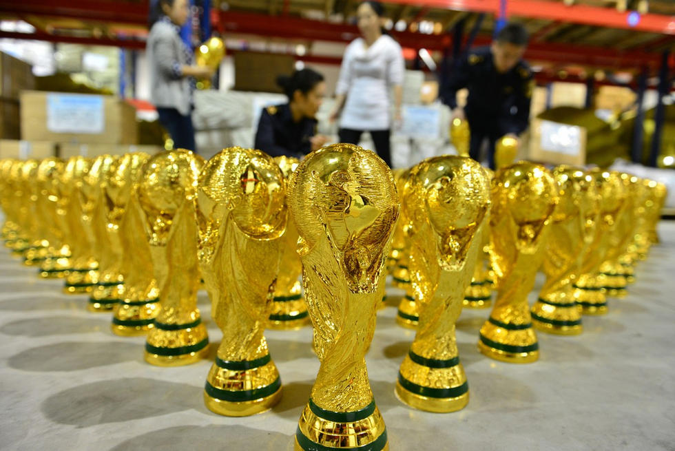 巴西世界杯開賽在即,市場上體育用品侵權的情況也逐漸增多。4月16日下午,浙江義烏海關對最近查獲的1020尊未獲得國際足聯(lián)授權的“大力神杯”進行清點暫扣。經(jīng)權利人確認,侵犯了世界杯知識產(chǎn)權,已依法立案。圖為海關人員對“大力神杯”進行清點。