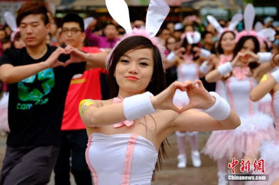 4月19日,北京某商場舉行復活節促銷宣傳活動,一群性感的“兔女郎”在街頭進行“快閃”表演。