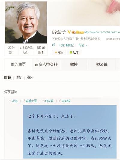 “七個多月不見了,久違了。”昨天下午,剛剛取保候審的網絡大V薛蠻子在被捕近8個月后首發微博,證實自己已辦理取保候審回到家中,并為“自己的不自律和過錯”向家人及粉絲致歉。他表示,未來會繼續堅持公益事業,一如既往地支持年輕人創業,并會吸取教訓,“堅決拒絕轉發、評論、傳播任何未經核實的信息,發揮正能量”。