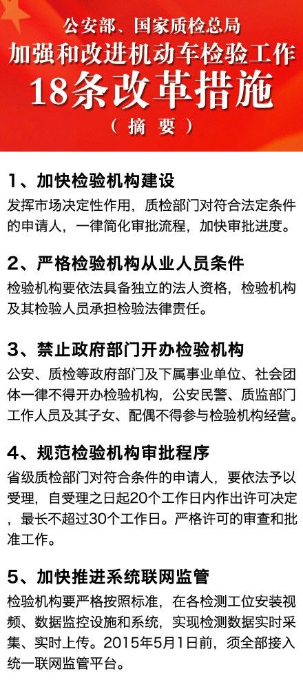 據公安部治安管理局、公安部“打四黑除四害”專項行動辦公室官方微博消息,根據公安部、國家質監總局《關于加強和改進機動車檢驗工作的意見》,公安、質監等政府部門不得開辦車檢機構,已開辦的,9月底前必須徹底脫鉤;自9月1日起,試行非營運轎車6年內免檢;不得指定檢驗機構,推動機動車異地年檢。