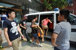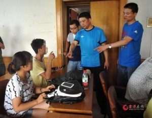 6月5日上午,多路民警來到這所大學,校門口一名穿著黑色T恤的男子引起民警注意,該男子不斷地出入學校門口,手上的電話不斷。經過民警辨認,這名男子就是發(fā)帖招募高考槍手的網友。每次,他從學校門口進來,就會領過幾個學生,并塞給學生鈔票。圖為6月5日,濟南,三名學生槍手出現,焦急的和嫌疑人王某聯系。
