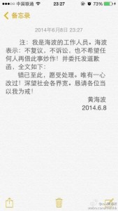 4、黃海波發(fā)致歉函表示不復議:一心改過