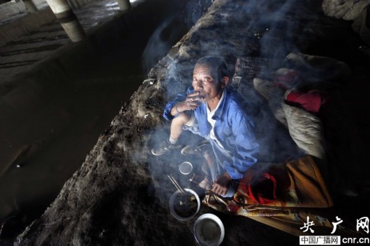 在寧波一處橋洞下,過往的車輛卷起了塵埃,路人無不掩鼻而行,匆匆離開。而在橋洞上方,一位光著上身、皮膚黝黑的老漢卻怡然自得,吃著雞塊、喝著老酒,吸引讓過往路人駐足觀看。