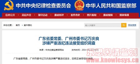 6月27日15時55分,中央紀委監(jiān)察部網站刊登了題為《廣東省委常委、廣州市委書記萬慶良涉嫌嚴重違紀違法接受組織調查》消息。消息內容非常簡短:廣東省委常委、廣州市委書記萬慶良涉嫌嚴重違紀違法,目前正接受組織調查。則這消息在第一時間被各大媒體網站轉載報道,由此拉開了“廣州市委書記萬慶良落馬”話題的序幕。
