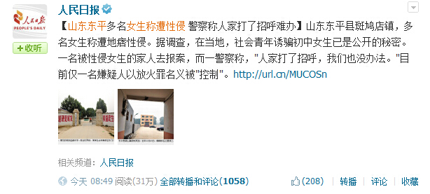 《新京報》報道稱,近日,該報接到舉報稱,山東省東平縣斑鳩店鎮中學一名初二女生被迫與三名吸毒男子發生性關系。記者調查發現,在當地,上述社會青年誘騙初中女生已是公開的秘密。除上述初二女生外,還有3名女生稱曾被迫與這些男子發生性關系。當地警方透露,犯罪嫌疑人承認發生性關系的女生,“從11歲到15歲的都有。”據調查,這幾名男子長期將車輛停在學校門口,通過QQ等聊天工具加女生為好友,通過送手機等方式騙取女生好感后發生性關系。